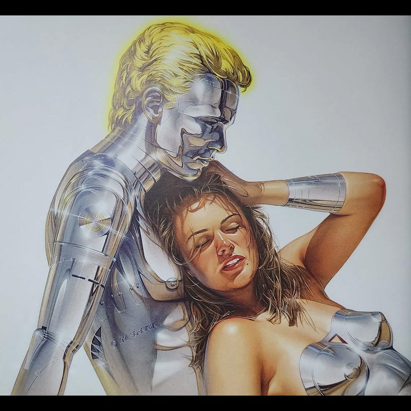 He often spends weeks perfecting a single artwork, rendering every curve, shadow, and reflection with technical brilliance. Yet behind the dazzling surface lies an artist deeply attuned to emotion and provocation. Sorayama doesn’t just paint robots—he humanizes them, giving cold metal the illusion of warmth, breath, and desire.